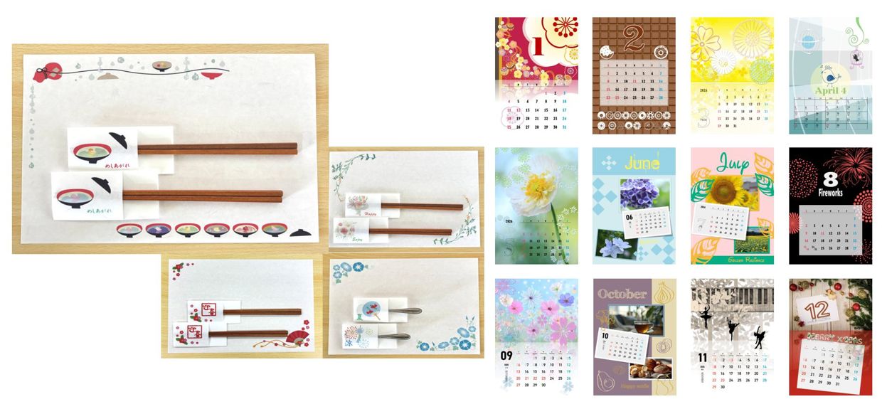 年賀状、カレンダー、ノート、ぽち袋、ティッシュケース、コサージュ・・・とバラエティ豊富。