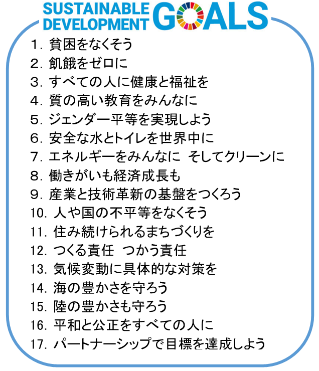 これは「Sustainable development Goals(サスティナブル・ディベロップメント・ゴールズ)」の略で、日本語では「持続可能な開発目標」という意味です。