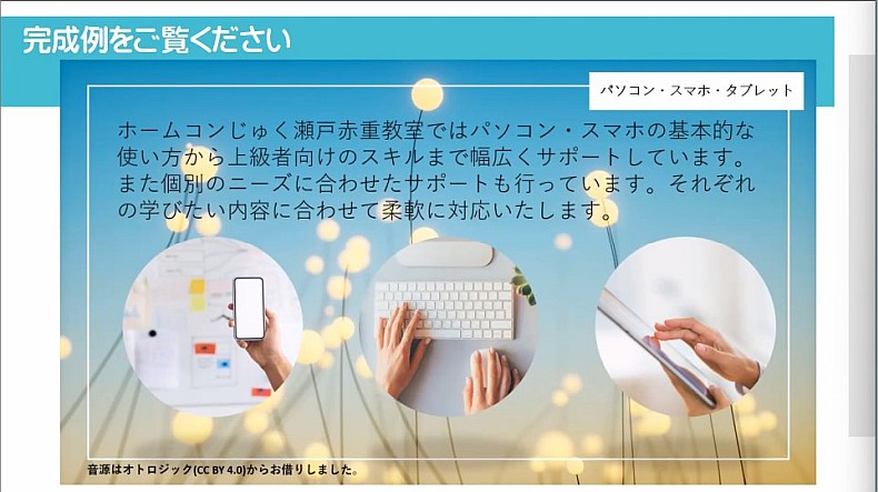 後半では、PowerPointで作るおしゃれな教室紹介動画の作り方についても勉強することができました。