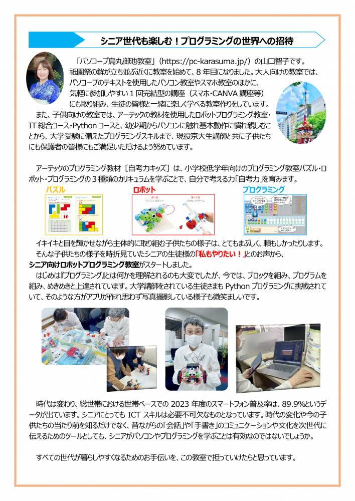 そこで、シニア向けにプログラミングをご指導されている「パソコープ烏丸御池教室」の山口先生にお話を伺いました。