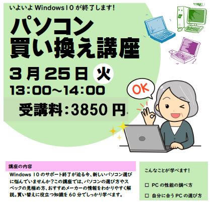 | 開催概要: | Windows 10 のサポート終了が迫る今、新しいパソコン選びに悩んでいませんか?この講座では、パソコンの選び方やスペックの見極め方、おすすめメーカーの情報をわかりやすく解説します。買い替えに役立つ知識を60分でしっかり学べます。 ●料金 3850円 |