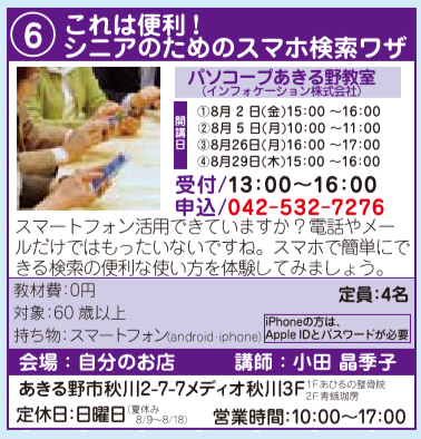 パソコープあきる野教室で開催する講座は、昨年も参加者の方にとても喜んで頂いた、「シニアのためのスマホ検索ワザ」です。