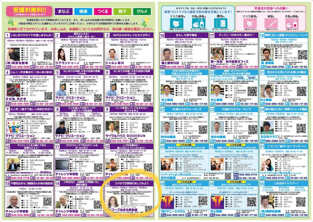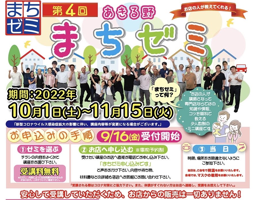 | 開催概要: | 「あきる野まちゼミ」とは、商店街の店主が講師を務め、各お店の専門知識やプロのコツを無料で提供するイベントです 2022年は、昨年の37講座を上回る『40講座』が開催されます パソコープあきる野教室も今年も参加しています |
