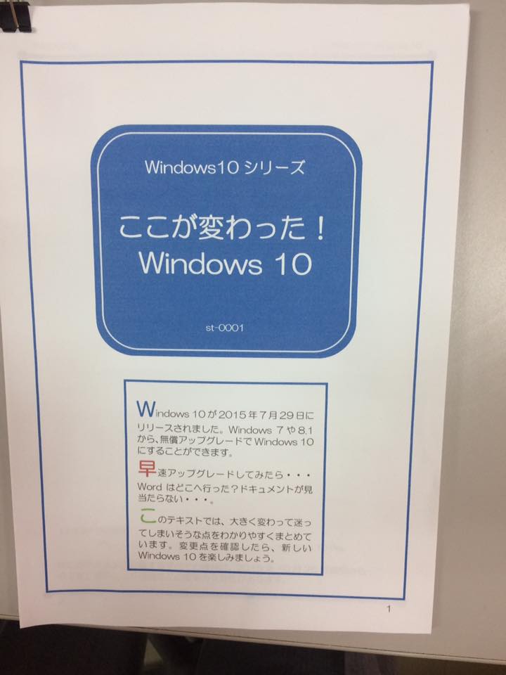 | 開催概要: | Windows10がリリースされて約1年半が立ちました。無償アップグレードでWindows10になった方やWindows10を新たに購入した方などから今までと大きく変わってしまい、よくわからないというお声を多数伺います。その声におこたえして変更点わかりやすくまとめたレッスンを開催します! |