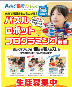 | 開催概要: | 年長さんから小学校3年生向けに楽しく自分で考える力を「パズル」「ロボット」「プログラミング」の3つのカリキュラムで学ぶクラスを新規開講します。2020年の小学校プログラミング教育必修化の前に低学年のうちに楽しく身につけましょう! |