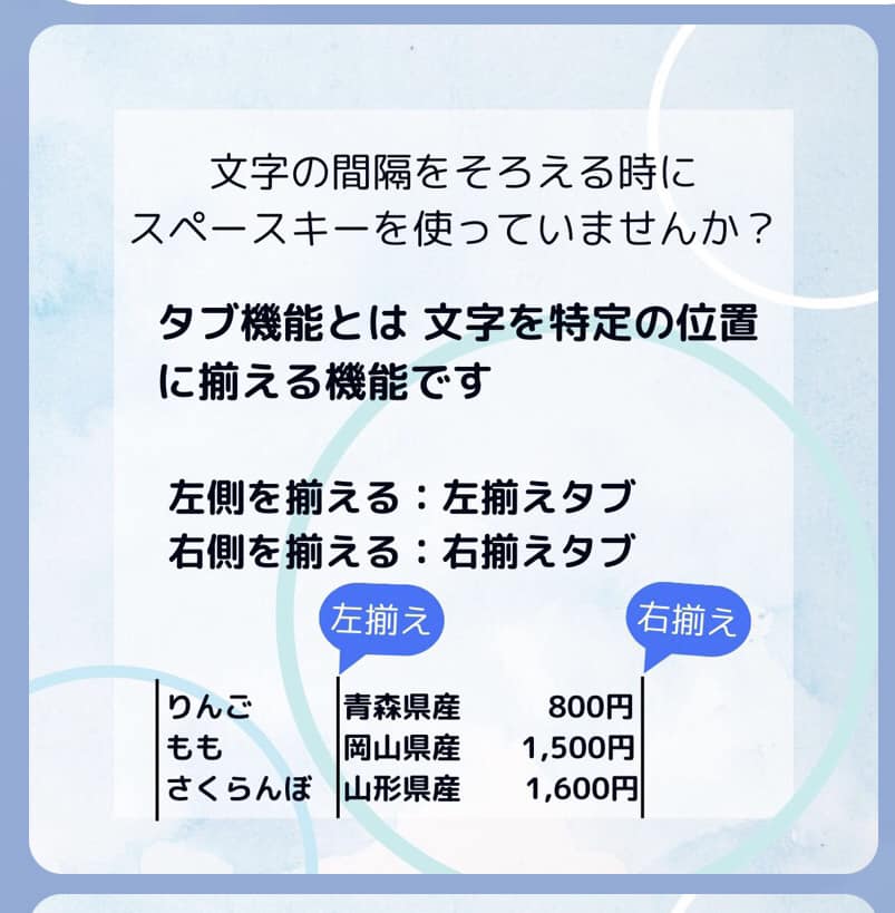 | 開催概要: | ワードで文章を作成する際に文字と文字がきれいにそろわずに苦労されたことはありませんか?タブ機能を使うときれいに揃えられます。今回の特別講座はタブ機能を学習します。 |
