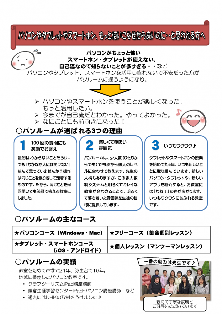 | 開催概要: | パソルーム新春企画、「スマホ・タブレット無料体験会&教室説明会」に、ぜひ一度いらしてみませんか? |