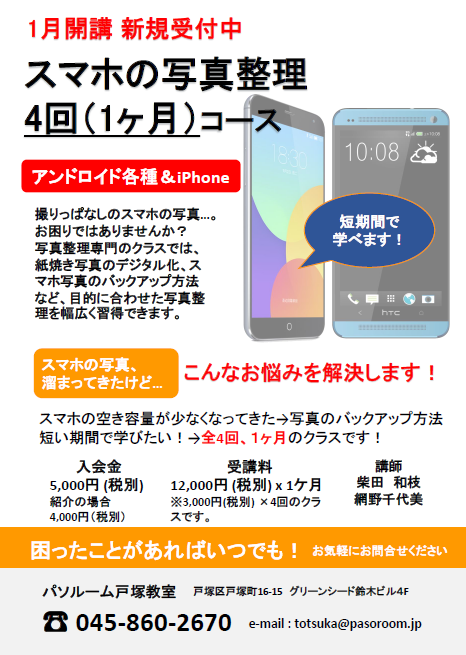 1月から戸塚教室で、スマートフォン(アンドロイド、iPhone)の写真整理講座を開講します!
