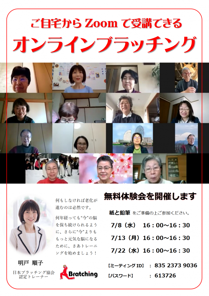 ブラッチングとは「頭のストレッチ運動」です。30分のブラッチングレッスンをZoomによるオンライン講座として開講します。まずはお試し無料レッスンにご参加ください。