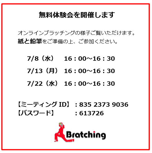 | 開催概要: | ブラッチングとは「頭のストレッチ運動」です。30分のブラッチングレッスンをZoomによるオンライン講座として開講します。まずはお試し無料レッスンにご参加ください。 |