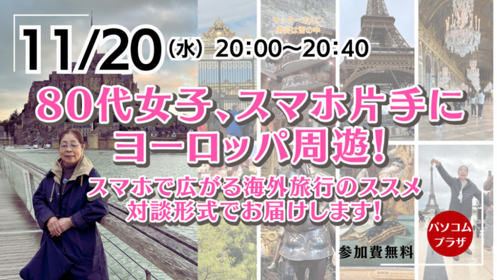| 開催概要: | 80代だってスマホを使えば、海外旅行も思いのまま!次回のウェビナーでは、実際にスマホを活用してヨーロッパを楽しんだ80代女子の生徒さんのエピソードをお届けします。 |