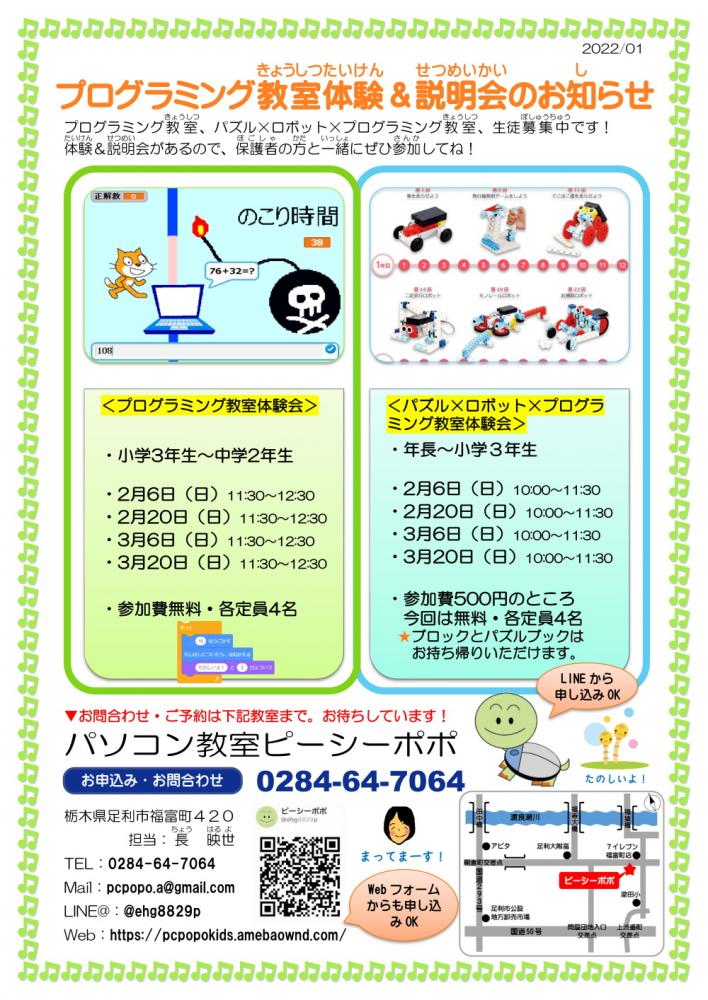| 開催概要: | ロボット教室・プログラミング教室体験会です!4月入会の生徒募集中! |