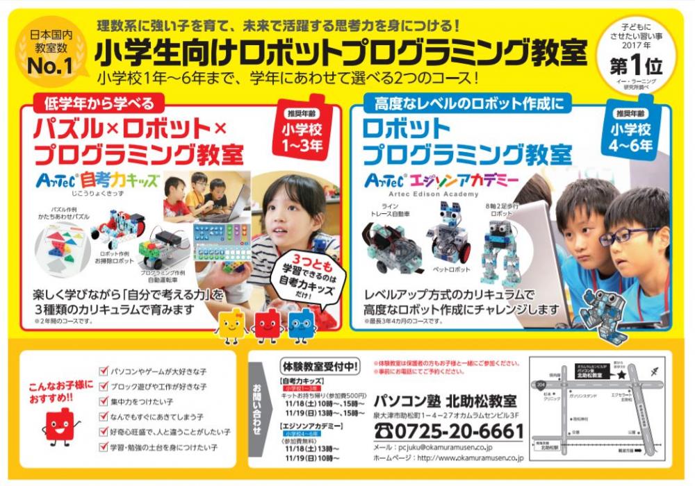 開催期間:2017-11-18~2017-11-19低学年向けの「自考力キッズ」の新規カリキュラムが来年よりスタートパズル×ロボット×プログラミング×パソコンの4種類のカリキュラムから自分で考える力を楽しみながら学んで頂けます。