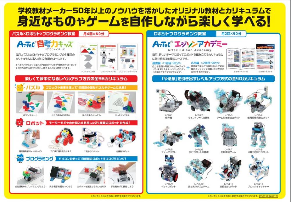 | 開催概要: | 低学年向けの「自考力キッズ」の新規カリキュラムが来年よりスタートパズル×ロボット×プログラミング×パソコンの4種類のカリキュラムから自分で考える力を楽しみながら学んで頂けます。 |