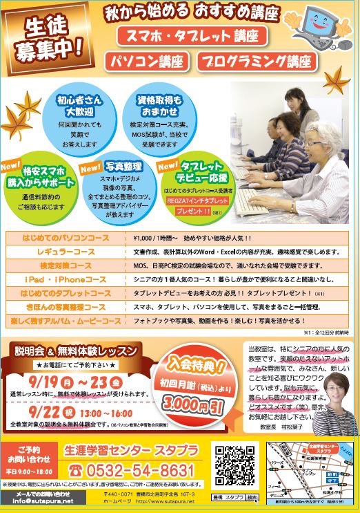 開催期間:2016-09-19~2016-09-239月19日(月)~23日(金)・通常授業時間での体験です。ご相談ください。英会話講座(要予約) 9月22日(木・祭)午後1時~4時 ※22日はPepperが皆さんをお迎えします!一緒に遊びましょう! ・パソコン教室、学習塾、英会話、プログラミングの各講座の体験説明会があります。