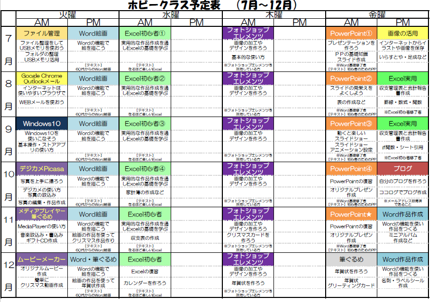 7月からのホビークラスの講座予定ができました