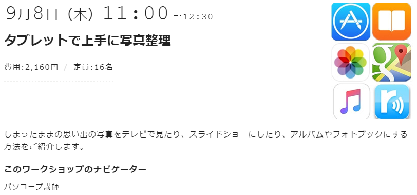 | 開催概要: | しまったままの思い出の写真をテレビで見たり、スライドショーにしたり、アルバムやフォトブックにする方法をご紹介します。 |