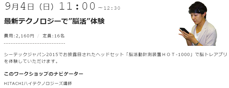 | 開催概要: | シーテックジャパン2015でお披露目されたヘッドセット「脳活動計測装置HOT-1000」で脳トレアプリを体験していただきます。 |
