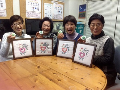 また、教室には「手芸クラブ」があります。 授業の後に家内を中心に生徒様5名のメンバー6名で小物のパッチワークを中心に作っています。 酉年のパッチワークとクローバーの刺繍の針山を作りました。