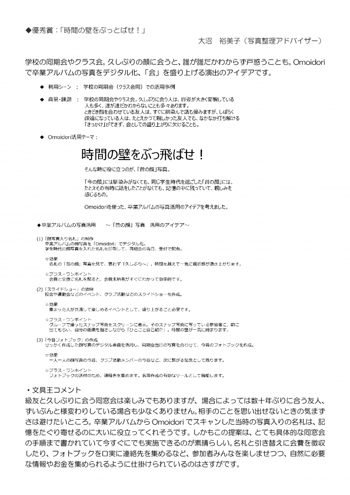 主 旨:写真をデジタル化することで、より身近にもっと楽しく今の生活を彩るためのOmoidori活用方法のアイデアを募集