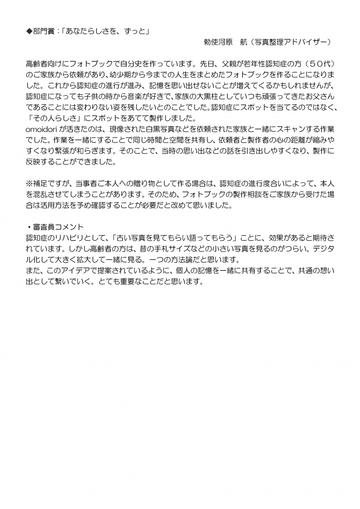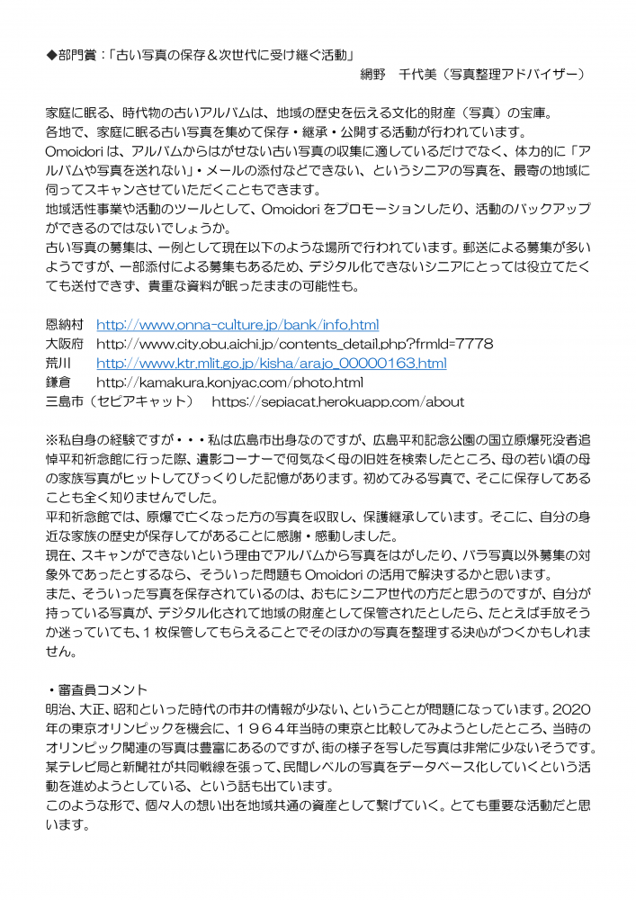 部門賞 :「古い写真の保存&次世代に受け継ぐ活動」網野 千代美(写真整理アドバイザー)
