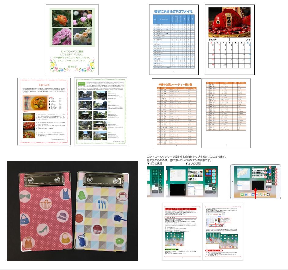 「美容におすすめアロマオイル」「カレンダー」「米寿のお祝いパーティー受付表」を作成しながら、