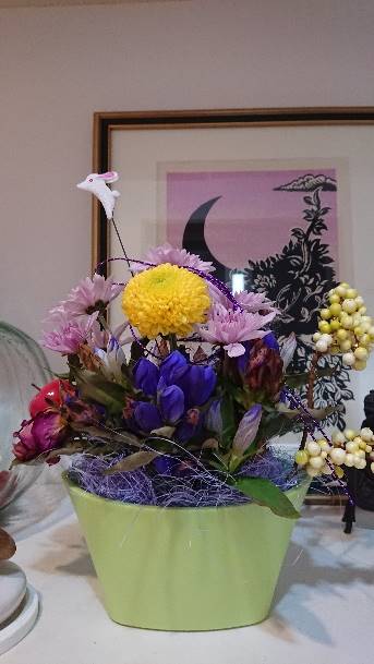 生徒さんのお一人がお花の先生で、月に一度パソコン教室が華道教室に変身します。9月は「うさぎと月」がテーマでした。