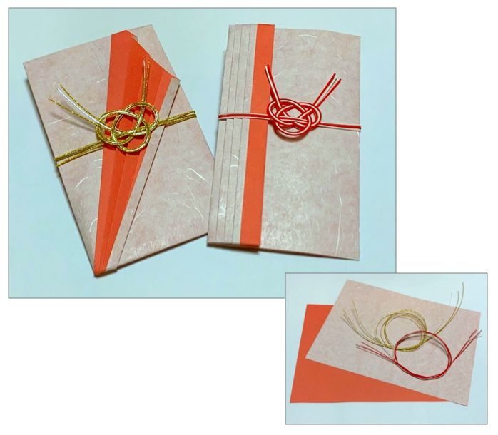 最後に「あわじ結び」の水引をかけます。水引は1本から3本まで、自由に組み合わせて使うこともできます。
