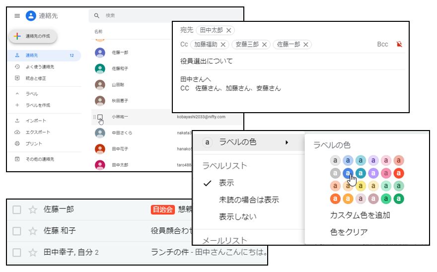 また、ラベルを作成して一斉にお知らせのメールなどを送ることができます。
