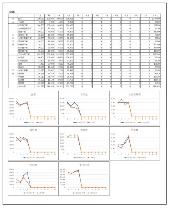 各月の合計をINDIRECT関数を使って入力し、表とグラフを作成して、予算と各月の使用金額の比較ができるようにします。