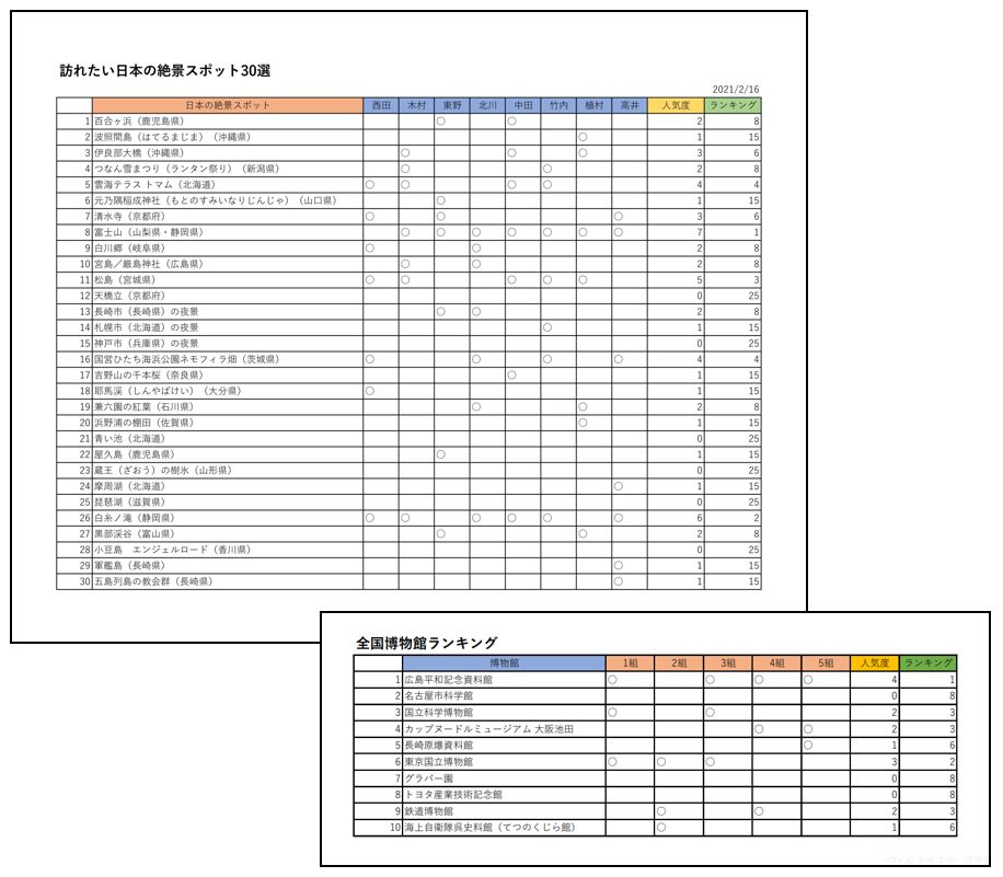 ある旅行会社が決定した「訪れたい日本の絶景スポット30選」をもとにアンケート用紙を作成し、アンケートの結果から関数を使って人気度とランキングを求めていきます。このテキストでは、COUNTA関数、RANK関数、TODAY関数を学びます。