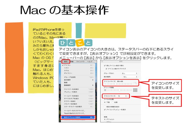 Macがはじめての人、これまでWindowsパソコンを使っていた人を対象に、Macの基本操作を習得します。