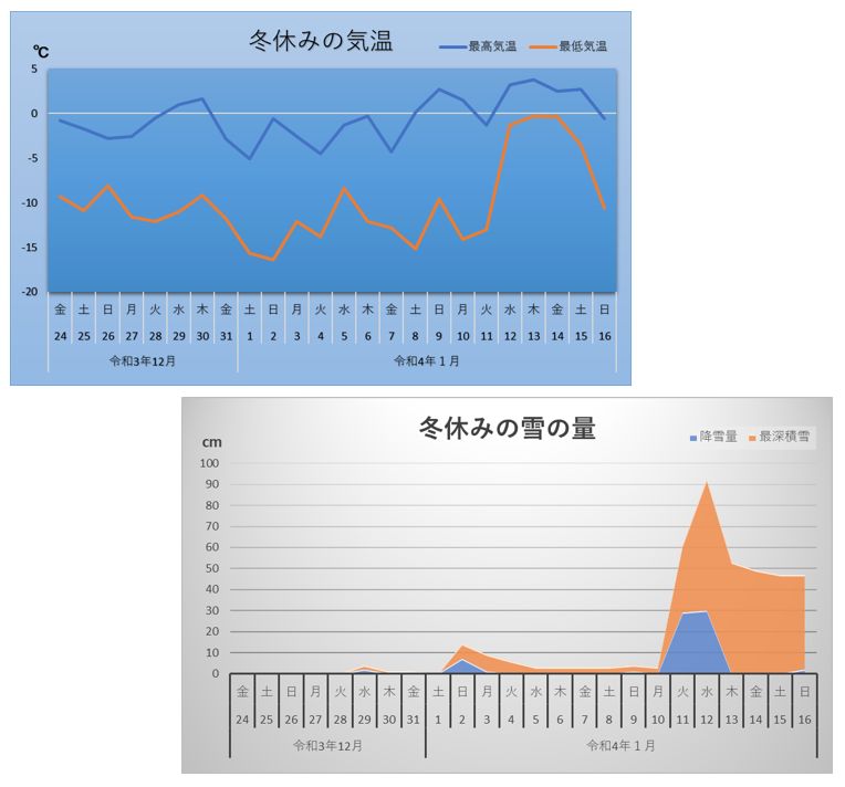 このレッスンでは、「おすすめグラフ機能」を使って、冬休みの気温と雪の変化を表すグラフを作成してみましょう。また、複合グラフの作成についても学びます。