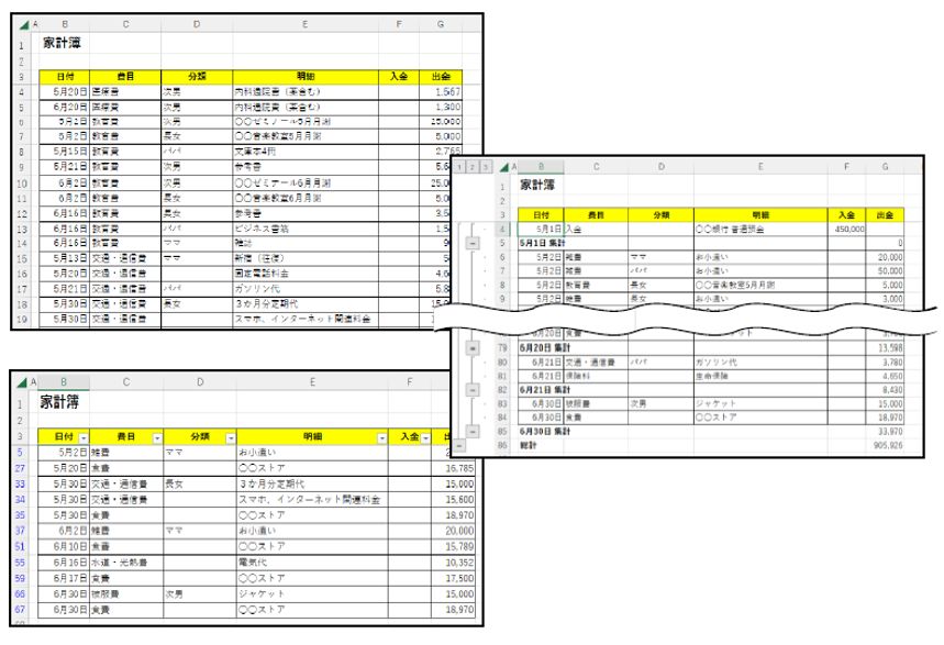 ・E-0138:データーベース機能を使って家計簿を管理しようデータベースとは、いくつかの項目が規則的な形式で整理されたデータの集まりのことです。データベースの作成方法とデータベース機能を学びましょう。