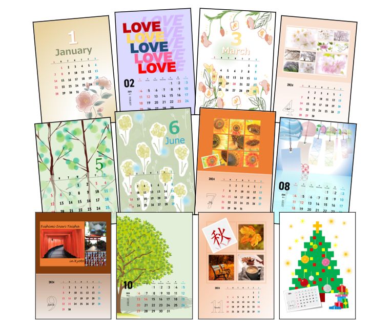 ・W-0214:Wordで作るMyカレンダー2024<季節のイメージにあった写真やイラスト、図形を組み合わせてデザインするカレンダーを作成しています。