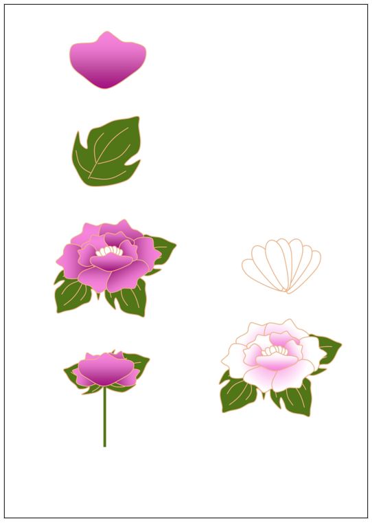 牡丹編では、頂点の編集で図形の形を変形し柔らかな花びらを描きます。花色などを変更して楽しむのも素敵です。