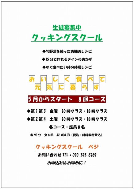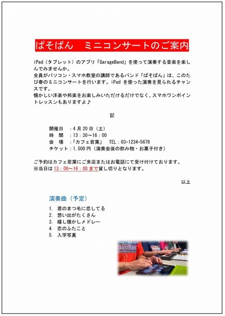 フォントやフォントサイズ、フォントの色の変更、また文字を強調するための書式を設定したり、文字の配置を変更したりして見栄えの良いチラシを作成します。