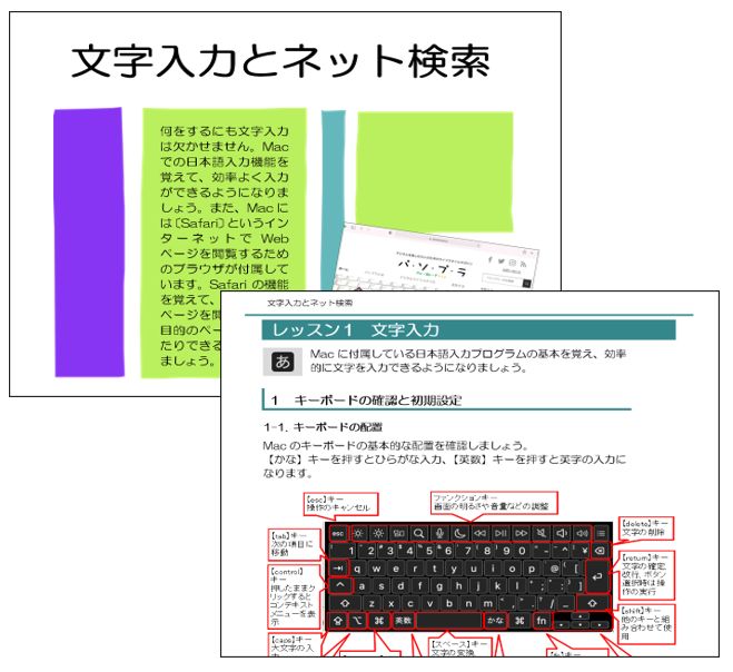 また、Macに標準で付属しているブラウザ〔Safari〕の機能を覚えて、楽しくWebページを閲覧したり、見たいページを表示したりできるようになることを目的とした内容です。