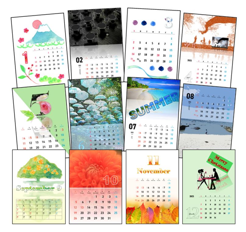 季節のイメージにあった写真やイラスト、図形を組み合わせてデザインするカレンダーを作成しています。