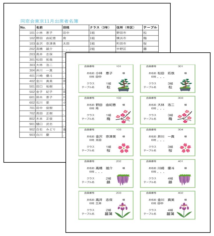また、会員番号を入力すると名前、旧姓、クラスと着席するテーブル名の入る席札を作ります。