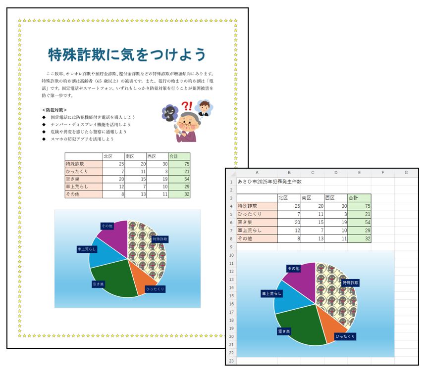 Excelで作成した表と絵グラフをWord文書に貼り付けて、ExcelとWordを連携させたリンク貼り付けを学びます。