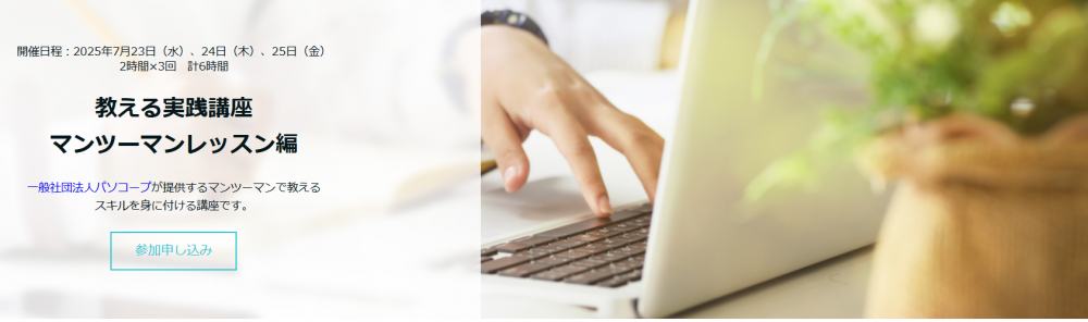 パソコープのインストラクター認定研修は、「教える実践講座<マンツーマン編>」と「教える実践講座<グループレッスン編>」の2段階で構成されています。